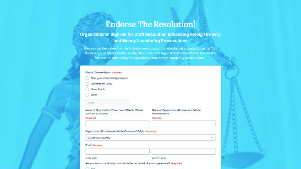 If you’re interested in getting involved, we suggest endorsing the proposal and joining our free online webinars led by the world’s top anti-corruption experts. Together, we can deeply invest in this new momentum to enhancing foreign bribery and money laundering prosecutions and have the influence and clout to make it happen. Now is time.